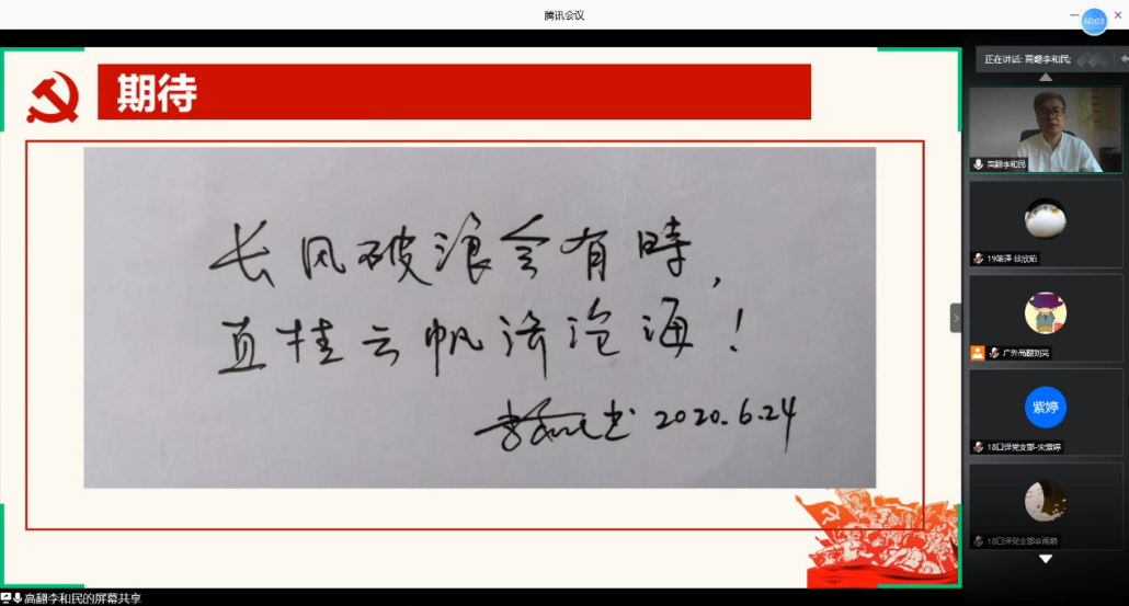 6月30日,为庆祝中国共产党成立99周年,我院举行线上2020届毕业生党员主题党日暨2020年“党课开讲啦”活动。学院党委书记李和民讲了“践行初心使命,放飞职业理想”专题党课,学院全体2020届毕业生党员、教工党支部和各学生党支部支委、辅导员等110多人参加。主题党日活动由学院党委副书记张林茂主持。