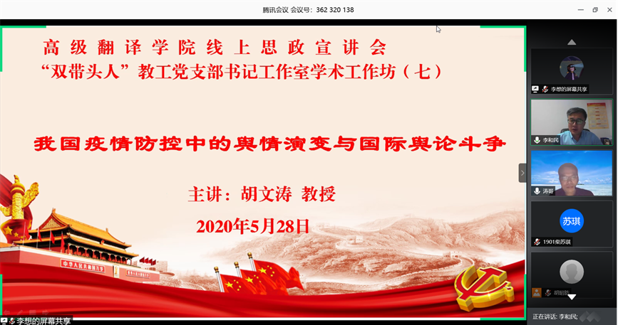 5月28日晚,我院举行线上思政宣讲会暨“双带头人”教工党支部书记工作室学术工作坊第7场,邀请了我校党委常委、宣传部部长、思政宣讲团成员胡文涛教授作主题为“我国疫情防控中的舆情演变与国际舆论斗争”专题报告,学院全体教职工、学生党团干部、第10期党员发展对象培训班学员和第50期入党积极分子培训班学员参加宣讲会。宣讲会由学院党委书记李和民主持。