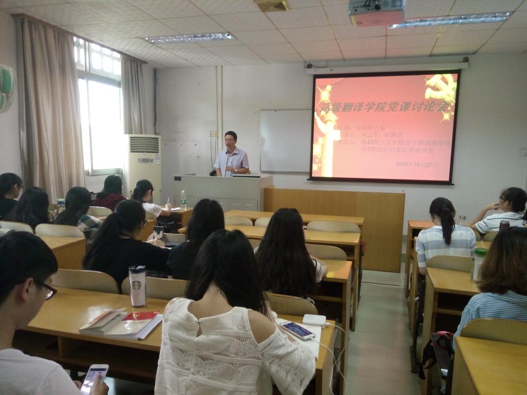 本网讯 10月27日,我院在四教420开展了以“信仰的力量”为主题的党课。高级翻译学院党委书记刘志军,党委副书记杜焕君为第四十三期入党积极分子、第三期发展对象培训班学员授课,并组织学员们观看学习 “信仰的力量”系列视频。