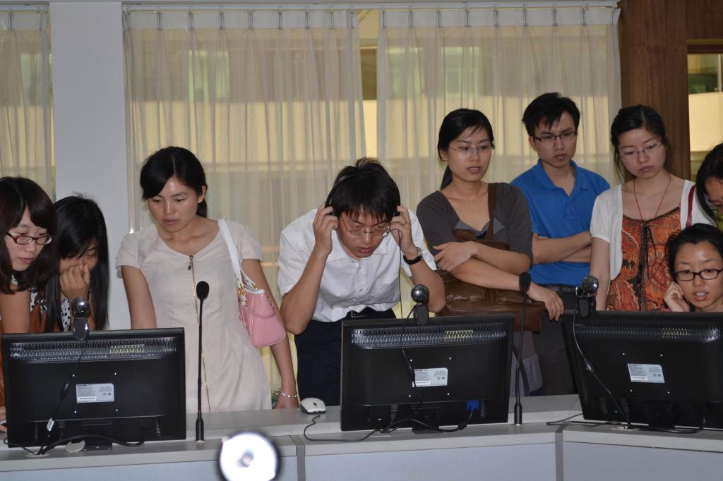 随后,蓝鸽公司员工带领大家参观公司产业园,同学们亲身体验了同声传译语音教学实验室的操作,观摩了蓝鸽英语辅导频道的审批现场,观看了蓝鸽公司的科研成果模型。