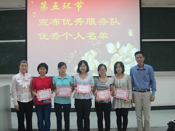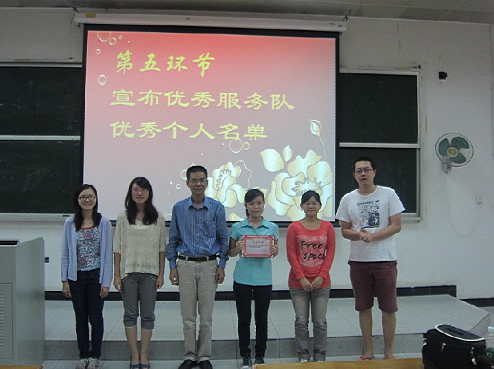 在对“优秀服务队”和“优秀个人”的进行表彰时,现场气氛达到了高潮。高云坚为获得本次“三下乡”优秀服务队的“创译队”和“诚译队”两支队伍进行了颁奖。随后,他和杜焕君又一同为获得“优秀个人”称号的王怡、梁伟玲、余倩雯、韩紫轩和莫颖菲颁奖。