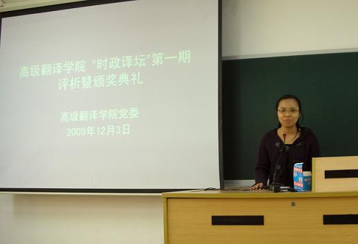 12月3日下午,高级翻译学院的党建品牌建设项目――“时政译坛”第一期活动在六教B214落下帷幕。翻译学院党委书记高云坚老师,笔译系主任刘季春教授以及学院辅导员杜焕君老师和全体学生党员、入党积极分子出席了评析暨颁奖仪式,刘季春教授对本次译文作了精彩的点评。