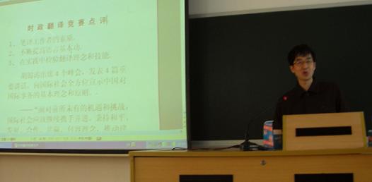 获一等奖的舒丽同学和二等奖的肖潇同学分别发表了获奖感言,并和大家分享了她们的翻译体会。她们表示,翻译学院学生党员的双重身份,赋予了我们双重的使命。作为学生,我们应该精湛自己的翻译能力,争做杂家;作为党员,我们应该与时俱进,关心国情和国际发展趋势。因此,学习翻译的学生不但要做专才,还要是通才(We should know everything about something ,and something about everything)。