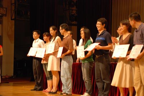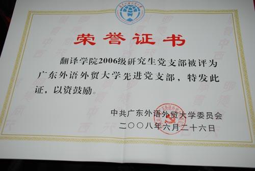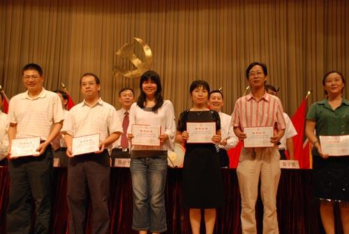 在6月26日下午校党委举行的庆祝中国共产党成立87周年暨表彰大会上,我院党委书记梁学宏被授予“优秀党务工作者”称号,笔译系主任李明老师被授予“优秀党员”称号,2007级研究生李春玲被授予“优秀党支部书记”称号,2006级研究生党支部被授予“优秀党支部”称号,支部书记赵睿代表2006级研究生党支部上台领奖。