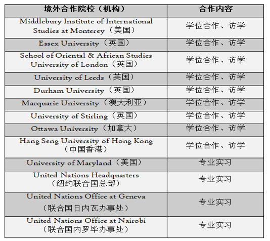 本专业与近20所国(境)外高校或国际组织开展学位教育合作或专业实习工作,如联合国纽约总部、联合国日内瓦办事处、联合国粮农组织、美国蒙特雷国际研究院、英国埃塞克斯大学、澳大利亚麦考瑞大学、加拿大渥太华大学等。
