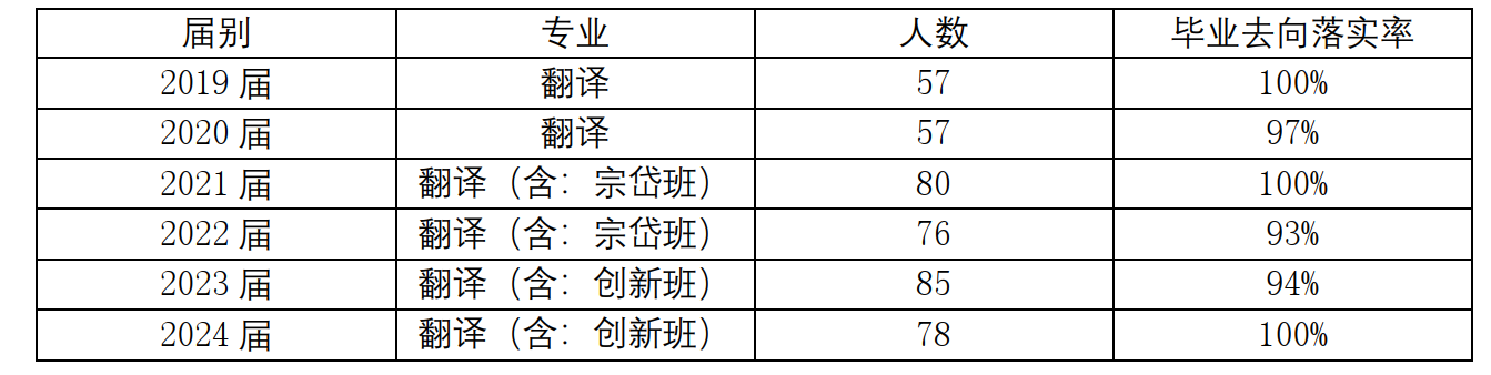 近年来,毕业生就业充分,供职去向有联合国等国际组织、国家部委、世界500强企业等;升学攻读硕士学位人数占40%,主要有北京大学、上海交通大学、复旦大学、同济大学、北京外国语大学、美国蒙特雷国际研究学院、美国宾夕法尼亚大学、香港大学、英国爱丁堡大学、澳大利亚国立大学等一流大学。