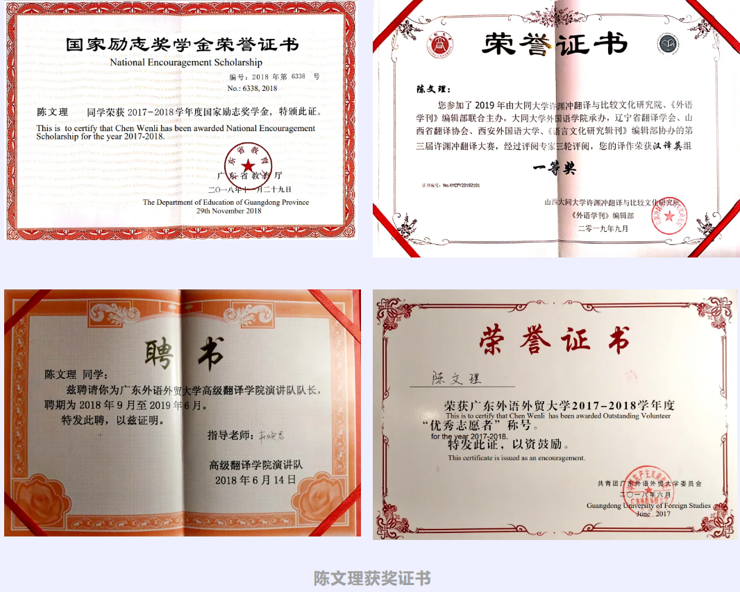 ·曾获第三届许渊冲全国翻译大赛汉译英一等奖,优秀学士、优秀共青团员、三好学生、优秀志愿者等荣誉称号以及综合测评一、三等奖学金。