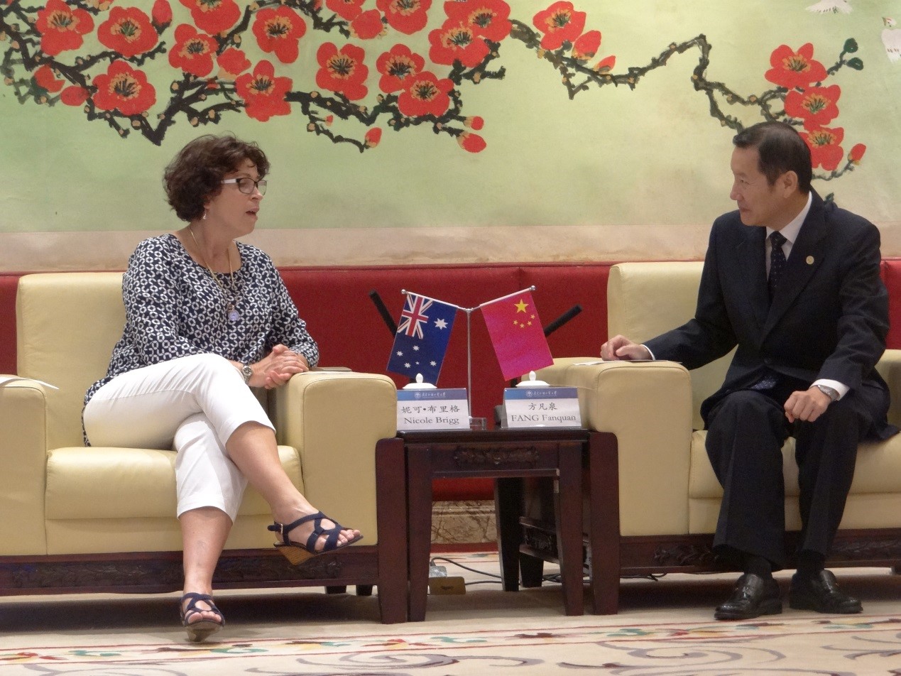 下午两点半,我校副校长方凡泉在行政楼贵宾厅会见麦考瑞大学代表团成员,高级翻译学院院长赵军峰等参加会见。方凡泉首先对到访代表团成员表示热烈欢迎,并介绍了我校翻译学科的发展和优势;麦考瑞大学副校长Nicole Brigg也介绍了麦考瑞大学特别是语言学科的基本情况,并期望能加强合作。高级翻译学院院长赵军峰则介绍了学院硕士教育的基本概况以及国际合作项目。