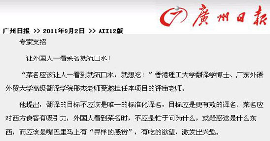 “译名是用在菜单上的,要简洁,不能写成说明书,必须在有限的空间内准确传神,一般菜名的长度以一到两行为佳,太长就变成了菜式说明书了,给客人增加了麻烦。”邢杰认为,翻译出来的菜名应该让人一看到就流口水,应对西方食客有吸引力,外国人看到菜名时,不应是忙于问为什么,或疑惑这是什么东西?而应该是嘴巴里马上有吃的欲望,激发出兴趣。