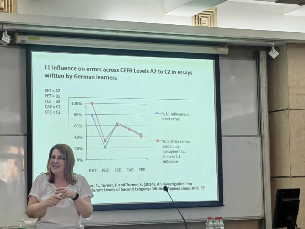在深入探讨语言学习的过程中,Littlemore教授通过实证研究数据,系统阐释了德语学习者写作能力的发展规律。她基于欧洲语言共同参考框架(CEFR)的分级标准,量化分析了母语迁移对写作错误的具体影响,并揭示了不同CEFR等级下隐喻类错误占比的阶段性变化规律,为跨语言认知研究提供了量化分析新范式。随后,Littlemore教授结合具体案例,解析了如何通过系统性隐喻教学法建构英语课堂教学模型,引发了与会老师和学生对语言认知理论与教学实践融合路径的热烈讨论。