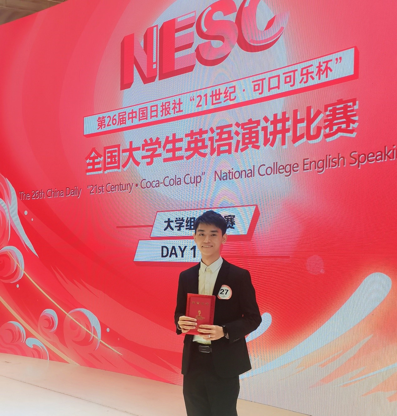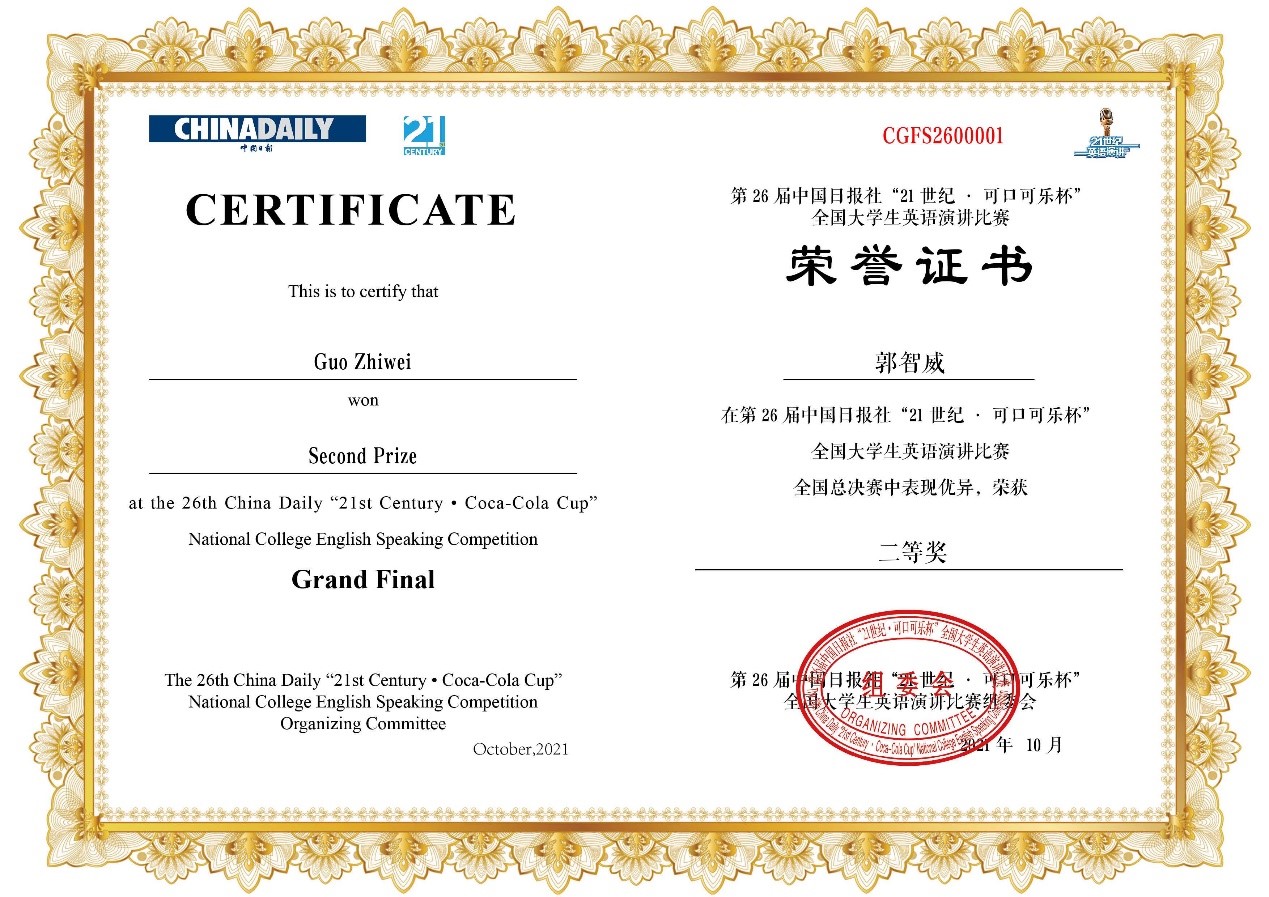 10月4日至6日,第25届中国日报社“21世纪杯”全国大学生英语演讲比赛总决赛在四川成都的“中国—欧洲中心”举行。翻译学院教授陈朗带队参赛,我院2019级翻译专业学生郭智威取得全国二等奖的好成绩。