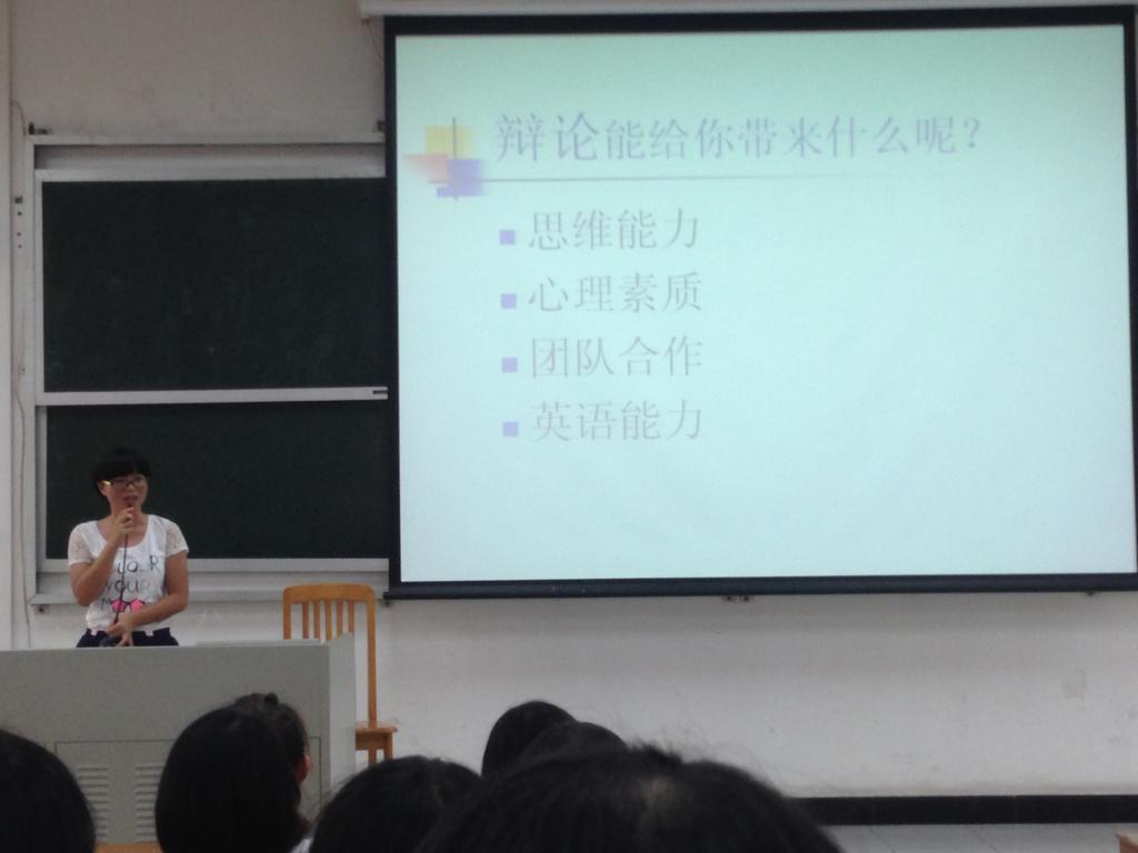 辩论队巧妙地利用翻译张京的例子,首先说明了辩论能力在英语学习中所占的重要地位。用简洁干练的语言向新生们介绍了辩论队伍的日常训练方式,并清楚地表述了辩论可以为新生带来的提高,例如思维能力、心理素质、团队合作、以及英语能力。整个宣讲过程中干脆利落,彰显出了辩论队特殊的魅力。代表黄祥最后以一句”we want you!”表达了对新生的欢迎。