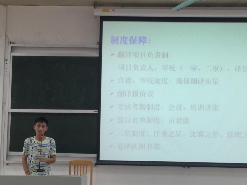 笔译队代表说明,作为四支队伍中最年轻的队伍,却于同时也是我院最壮大的一支队伍。它由一队37人、二队18人组成,全部为MA或MTI研究生。并且从较专业的角度切入,阐述了自身的制度保障,欢迎有各方面能力的高翻学子加入笔译队。