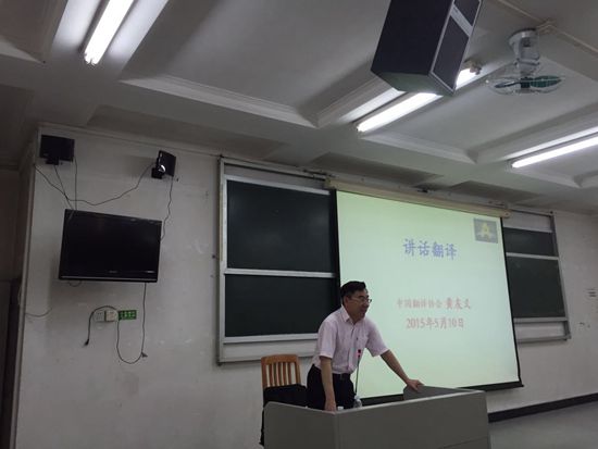 本网讯 5月7日上午,我校云山讲座教授、国家外文出版事业发行局原副局长兼总编辑、中国翻译协会副会长、翻译专业教指委主任委员黄友义做客我院,为同学们带来了一场以“讲话翻译”为主题的讲座。讲座由詹成副院长主持,学院部分研究生参加了本次讲座。