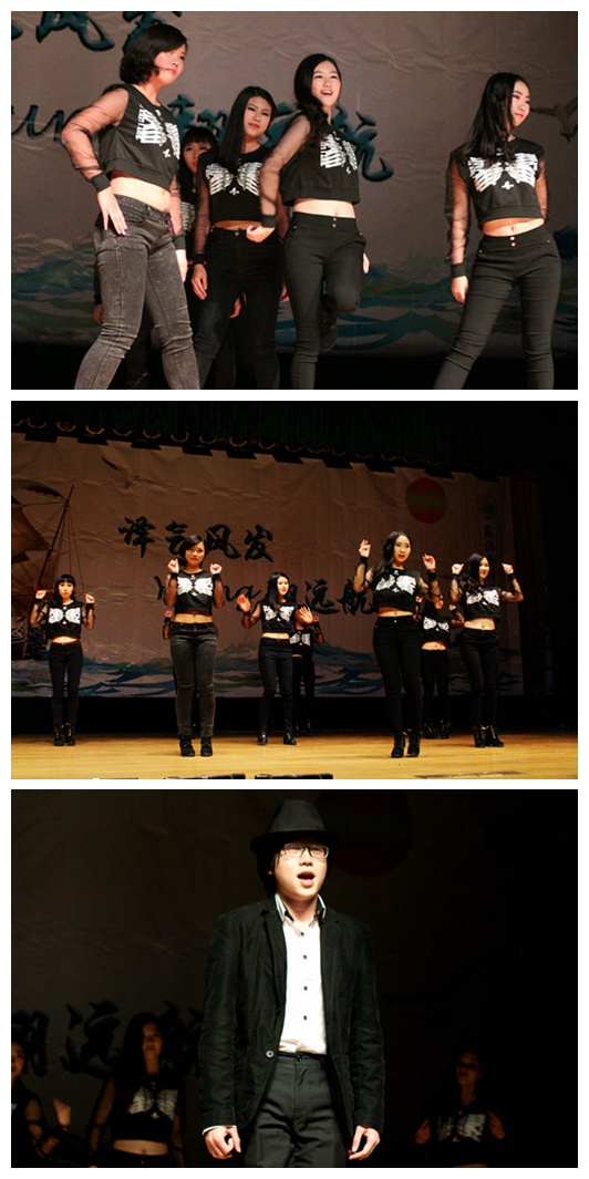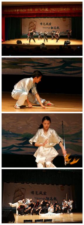 晚会歌曲声声悦耳,更少不了英姿飒爽、舞姿动人。长剑三尺水,敢敌明月斗秋霜;斗棍刚且强,叱咤风云仁不让。武者叱咤舞台之上,台下观众掌声连连,精彩的武术表演展现了学子的飒爽英姿,成为晚会的一大亮点;13级本科带来的舞蹈“My Stage”充满青春活力,无论是女生们性感演绎的群舞“Genie”,还是致敬迈克尔·杰克逊的月球漫步,舞者飞扬的神采都给观众留下了深刻的印象;由13级本科带来的创意光影舞,堪称今夜最神秘的节目之一:只见黑暗中面具轻灵舞动,鸽子自在飞翔,最后演员用手拼成的笑脸及“I LOVE SITS”的字样,则表达了高翻学子对学院真挚的爱意;舞蹈“烟花三月”中,舞者腰肢款摆、舞步轻盈,手执水红的油纸伞,演绎出江南女子的柔情似水;校模特队的展示也是一场“无声的舞蹈”,伴着优美的歌声,俊男美女齐齐亮相,或沉静不语,或巧笑倩兮,无不带给观众美的享受。