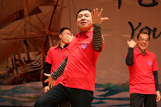 晚会最受期待的压轴节目,由教师表演的舞蹈《高翻小苹果》掀起了今晚的高潮。作为领舞者,詹成老师青春活泼的舞步赢得了全场观众热烈的掌声。两位可爱小嘉宾的加盟更是引得欢呼连连,台下观众纷纷举起手中的相机或手机拍下这温馨的一幕。有的观众还高唱《小苹果》来表达对老师的支持。正如主持人所说“高翻是个有爱的大家庭”,师生间的情谊在这个精彩的节目中展现无遗。值得一提的是,经全场观众投票后,《高翻小苹果》获得了本场晚会的“最佳人气奖”。
