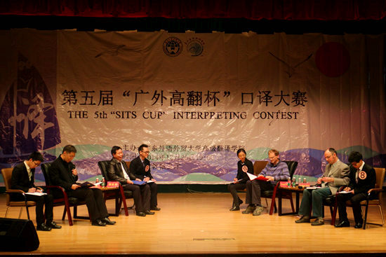 联合国资深译员陈锋先生和平洪、詹成、钱芳、余怿四位教师受邀担任本次口译大赛的评委。翻译学院党委书记刘志军、翻译学研究中心主任莫爱屏、副院长李明、党委副书记杜焕君、翻译学研究中心秘书吴迪以及辅导员王斌等作为嘉宾出席了本次比赛。