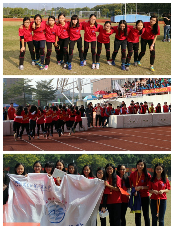 振奋人心的是,15日上午的进行十人十一足比赛更是将团结的力量发挥到极致,为我院代表队斩获第一面奖牌。10人11足作为我校校运会的新晋项目,设立的时间虽短,却受到了学生热烈的欢迎,赢得了极高的参与度。在今年5月举行的北校预选赛中,我院代表队获得了第三名的好成绩,最终进入到校运会的淘汰赛环节中。8:30分,第一轮比赛准时开始,只听裁判员一声哨响,13级的10位女生一起迈开大步,向终点冲去。第一轮结束后,她们以第四名的成绩进入到决赛中。在接下来的比赛中,虽然面对强敌,她们却面带微笑,坦然面对,齐心协力迈开步伐,不到终点绝不松懈。最终,功夫不负有心人,我院代表队获得11人10足比赛的季军。颁奖环节上,10位运动员激动不已,很多人称“到现在还不敢置信”,是“自己人生中第一次走上领奖台”。谈及此次获奖,队员向月怡认真地说道:“我们从去年5月进入决赛后就开始准备,这一个月来更是每周都安排2-3次集训,中间有人受伤、有人因故退出,但大部分人都咬牙坚持了下来。队友们相互打气,协同合作,提高默契度,可以说,团队精神是成功的关键。”