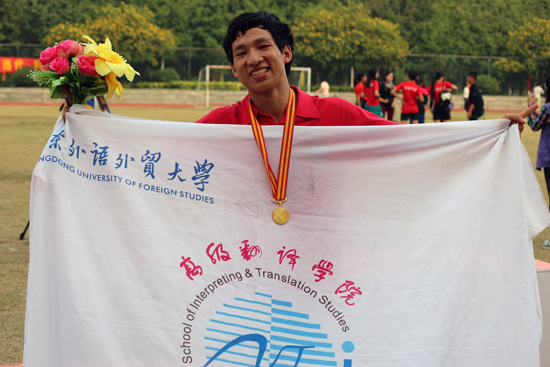 在赛场外,我院的工作人员都在各自的岗位上尽职尽责,为参赛的运动员提供力所能及的帮助与鼓舞。最值得赞扬的,是我院强大的拉拉队团体,气势毫不亚于其他学院。选手们一致称赞:“拉拉队加油的声音非常大,感觉很有动力”,双冠王林雄辉也对拉拉队表示感谢:“很感谢高翻的所有兄弟姐妹、所有拉拉队员。拉拉队给我喊了很多次加油,他们声音很大,立刻让我跟别的选手区别开来。”