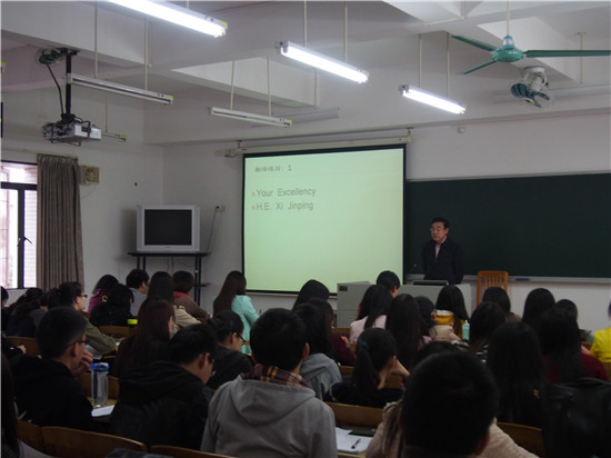 在课堂上,针对在场同学对某些词汇翻译的疑问,黄局长对不同的版本进行了耐心细致、风趣幽默的解答。并说:“好的翻译都是探讨出来的,而不是仓促完成的。”