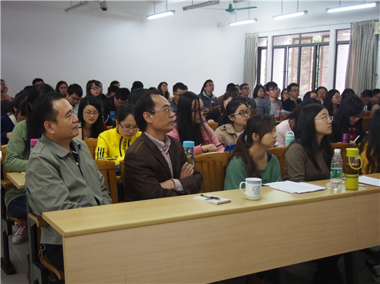 本网讯11月12日上午,我校云山讲座教授、国家外文出版事业发行局原副局长兼总编辑、中国翻译协会副会长、翻译专业教指委主任委员黄友义先生,在我院副院长赵军峰和翻译学研究中心主任莫爱屏的陪同下来到教学楼,再次为我院学生授课。授课对象是2014级MTI口译方向研究生。此次授课主题是关于中国文化对外交流的汉译英翻译。黄友义先生讲授了形式多样、内容丰富,引人入胜、发人深思的一课。