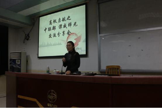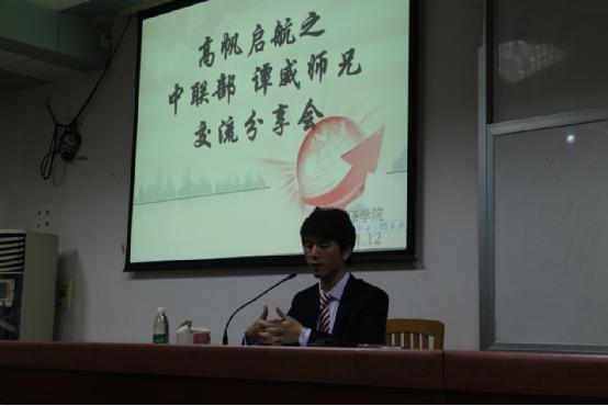 本网讯11月12日晚8点,高级翻译学院09级MA同传方向、现就职于中联部的谭威在四教424与众多翻译学子分享了翻译学习的经验及中联部工作的体会。党委副书记杜焕君出席交流会。本次交流会以“高帆启航——中联部谭威师兄交流分享会”为主题,谭威师兄的倾情分享,给了在场的同学极大的启示。