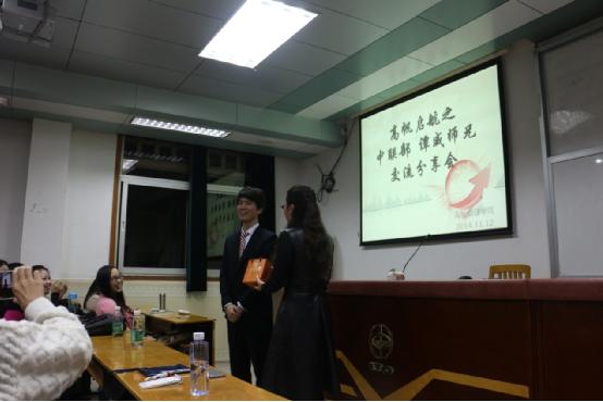最后,杜老师就谭威的交流分享作了总结,并赠送谭威学校50周年纪念礼物。交流分享会在热烈的掌声中结束。