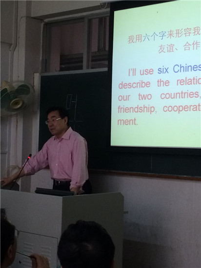 课堂上,黄友义以自身作为中国翻译总编辑,和参与各种翻译实践总结出的经验,首先和大家探讨了中国目前走向世界的桥梁,翻译话语权,以及其中存在的一些问题,并进行了扩展讲解;其次,他指出,中译外没有捷径可走,译者应该更加关注外国人的思维习惯和本国的文化特色。在阐述这两个要点时,黄友义附以生动而充分的实例加以分析,让同学们更加深入地了解了翻译的重要性和需要注意的要点。