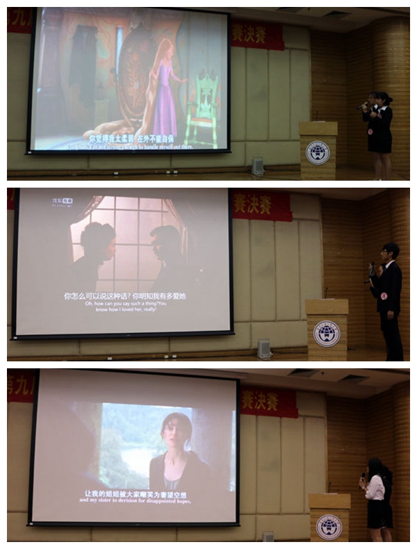 本科生组的比赛中,8位选手初生牛犊不怕虎,也展现了不俗的实力。故事朗读后进行的电影配音环节,将整场比赛引入最高潮:疯狂原始人、魔发奇缘、乱世佳人、傲慢与偏见,一段段熟悉的电影场景,加上选手们生动的配音展示,让现场的气氛迅速活跃起来。一声叹气、一口哭腔、一句呼喊,选手们深情地投入,让观众们仿佛身临其境,享受着别开生面的视听盛宴。