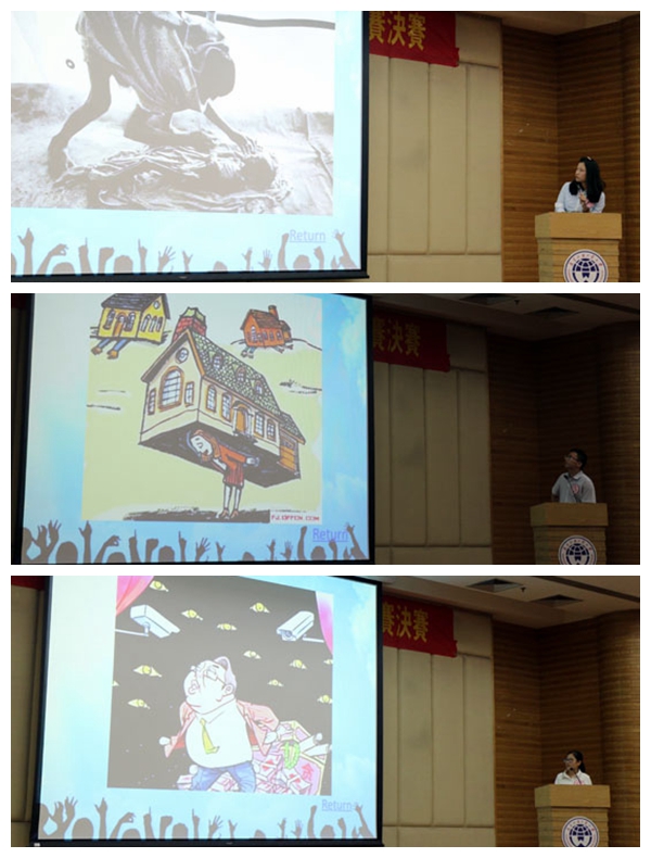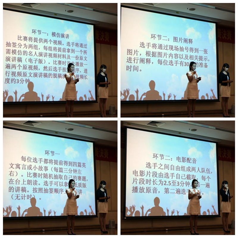 在研究生组的比赛中,5位选手根据英美音分组分别模仿了英国首相卡梅伦、美国脱口秀主持人奥普拉的演讲片段。每位选手流利完成了各自的演讲,充分展示了出色的语音语调。在极具挑战性的图片阐释环节中,选手们展现了出色的临场反应能力,即使在极短的准备时间内,也能流利地、完整地阐述自己对图片内容的看法。