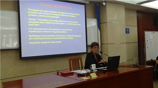 她指出,随着全球化和区域一体化的发展,多语言交流越来越多,如何让不同国家的人民充分理解一国法律显得格外重要。这就要求法律翻译者不仅能够理解法律条文中某个词条或句子的意思,更重要的是明白这些词句具有怎样的法律效力。法律翻译效果会受到一国法律、语言及文化的影响,一个国家有自己的法律规定和法律来源,而这些都反映出一国特有的文化。法律翻译者面临的挑战就是如何克服这些差异,达到最终法律实施的效果。最后,她列举了同一法律条文在法语和英语中的不同表达,以此来阐述法律翻译中所遵循的“功能对等”原则。