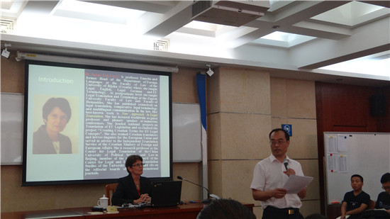 本网讯10月13日下午,西方法律翻译研究界知名学者、克罗地亚里耶卡大学法律系教授SusanŠarčević为我院学子开展了一场题为“Basics Of Legal Translation”的专题讲座。本次讲座为“著名教授论坛第242讲”,由人事处、教师发展中心主办,高级翻译学院承办。讲座由高级翻译学院副院长赵军峰主持,校党委副书记陈建平为Susan赠与我校纪念品并合影留念。高级翻译学院副院长李明、商英学院老师徐优平等参加了讲座。