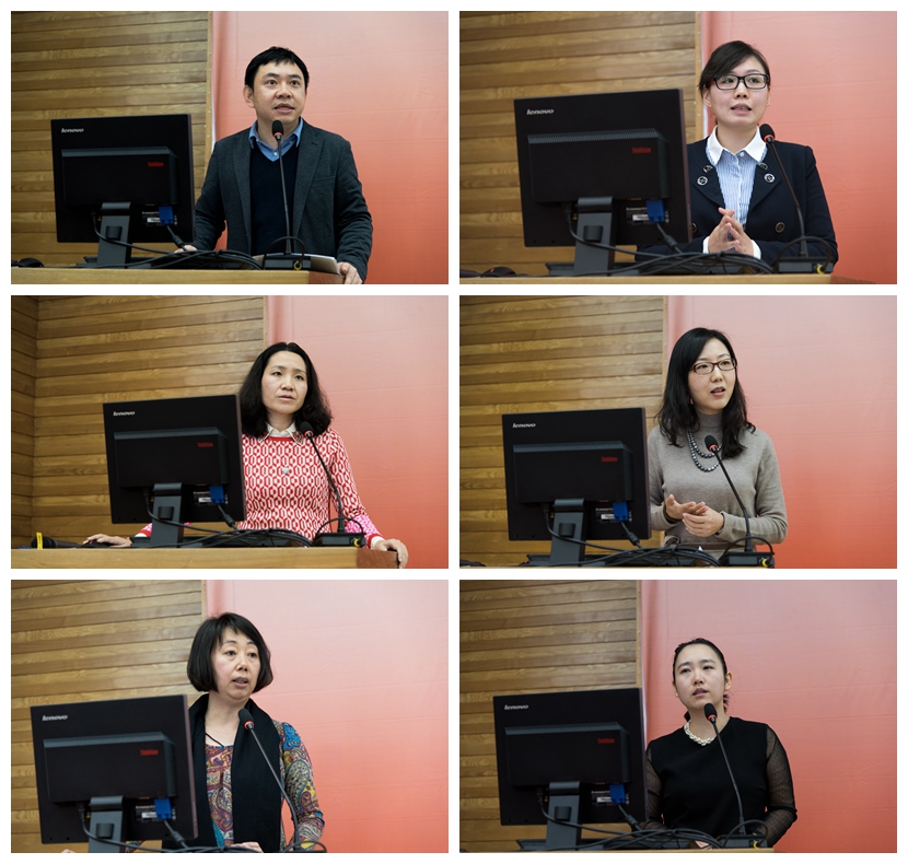 我校国家级教学团队——英语口译系列课程团队随后作集体发言。詹成详细解释了口译教学“广外模式”的理念与原则。“针对不同层次的学生,教学重点也不一样。采用何种方法,取决于课程定位。教学设计环节也应符合教学目标。”他分享了一系列见解,如双语能力,言外知识,口译技能是译员基本能力。他提出教学中应避免的误区,并根据图表解释、总结了口译教学的“广外模式”——“以理论板块课程进行指导,以技能主线课程进行技能分解、语言主线和专题主线课程进行技能强化,以实践板块课程进行技能整合”。唐芳、王丹、贾兰兰、詹成、张丽华分别介绍了理论板块、技能主线、专题主线、语言主线和实践板块的课程设置和教学操作。王巍巍则介绍了如何通过口译评估来评量学生的学习效果和能力发展。