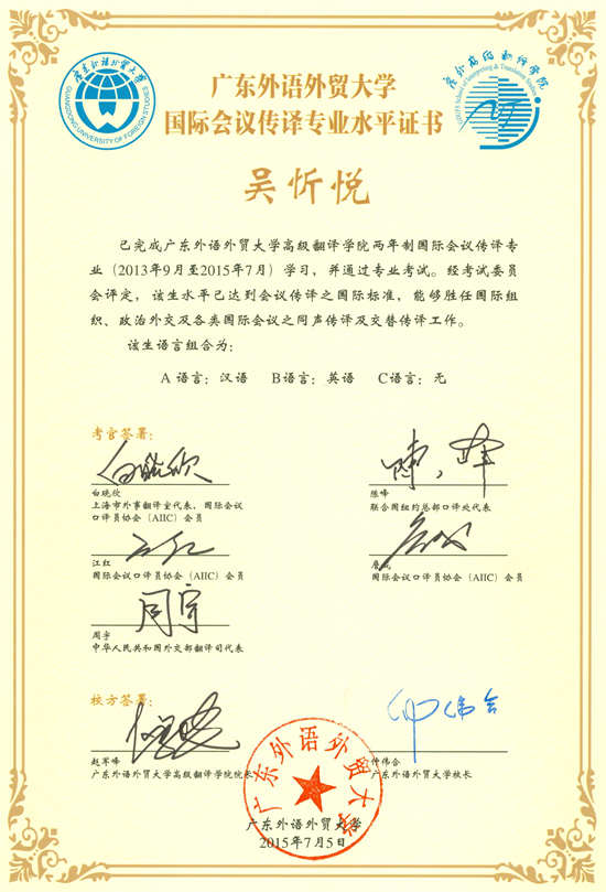 经过两天考试,广外国际会议传译证书班首批学员中,高万锐和吴忻悦两人全科通过,获颁“广外国际会议传译专业水平证书”;其余5名同学获得“广外国际会议传译专业结业证书”。
