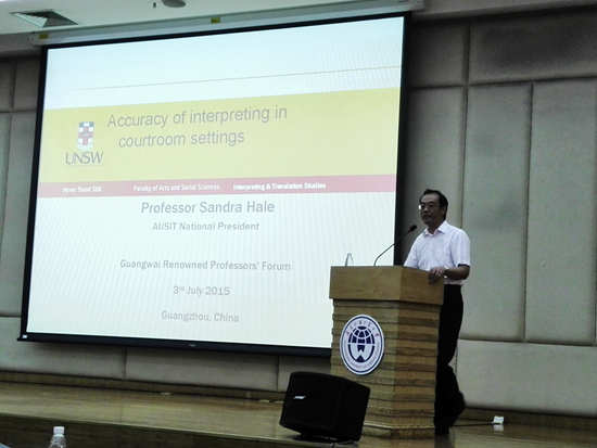 本网讯 7月3日下午,澳大利亚新南威尔士大学教授、澳大利亚翻译协会会长Sandra Hale在图书馆报告厅为广外师生带来了题为“Accuracy of Interpreting in Courtroom Settings”(法庭口译中的准确性)的演讲。该讲座吸引了许多来自法律英语专业的同学、老师以及国外学者。出席本次讲座的院领导有高级翻译学院院长赵军峰教授、副院长李明教授等。