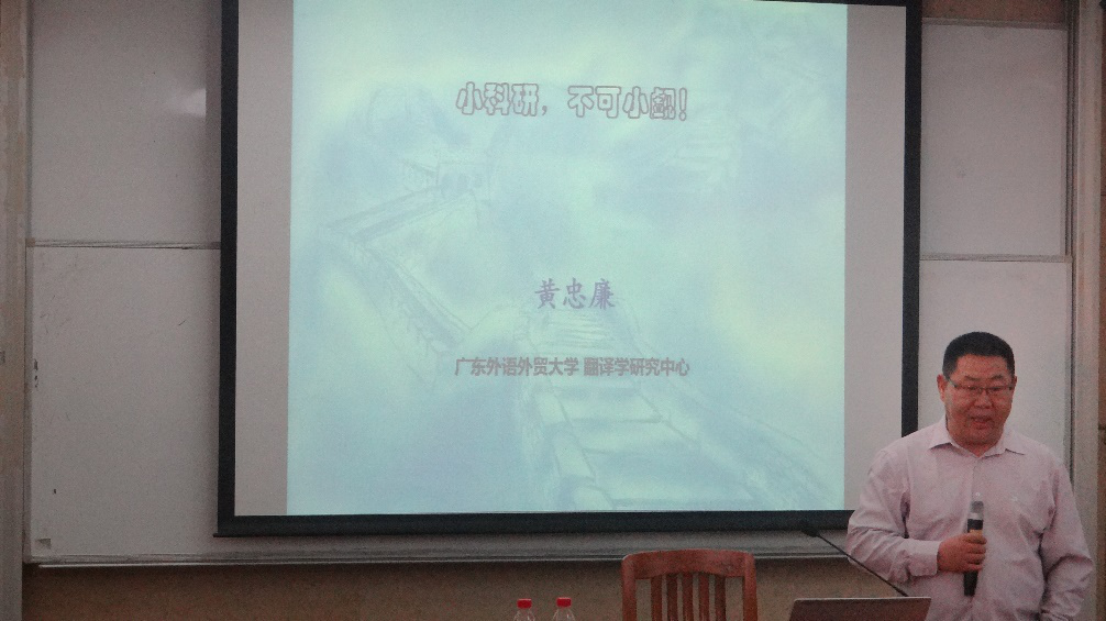 10月12日下午,岭南译学前沿讲座第146讲在六教B103拉开帷幕。广东外语外贸大学博士生导师和博士后协作导师、广东省“珠江学者”特聘教授黄忠廉教授为大家带来题目为“小科研,不可小觑”的精彩讲座。讲座由我院褚东伟教授主持。