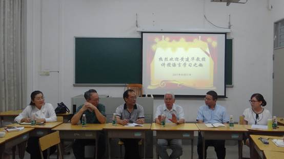 10月11日晚,我院在四教113为宗岱班的同学开展了有关双语学习的座谈会。本次座谈会邀请了广东外语外贸大学原校长黄建华教授作主讲。出席本次座谈会的还有学院院长赵军峰,学院党委书记刘志军,联合国原逐字记录处处长、会议和出版司副司长、云山资深教授傅鹏辉,学院党委副书记杜焕君,院长助理唐芳,教学秘书高菲和辅导员颜梁柱。