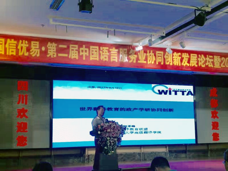 “国信优易·第二届中国语言服务业协同创新发展论坛——暨2017年语资网会员大会”于2017年8月12日、13日在成都开幕。全国政协委员、全国翻译专业学位研究生教育指导委员会主任委员、中国翻译协会常务副会长、WITTA战略顾问黄友义教授,全国翻译专业学位研究生教育指导委员会秘书长、我院院长、WITTA秘书长赵军峰教授,我院教师穆雷教授、WITTA常务副秘书长麦文先生、教师发展国际研究中心梁悦教授、多语大数据研究中心王华树博士等一行出席此次会议。