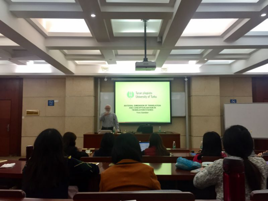 本网讯 11月29日下午,一场以“翻译所使用的媒介的范围”为主题的讲座在六教B103教室精彩开讲。本场讲座是岭南译学前沿系列讲座之一,主讲人为来自芬兰Turku大学的Yves Gambier教授。讲座由我院青年教师邹兵博士主持。