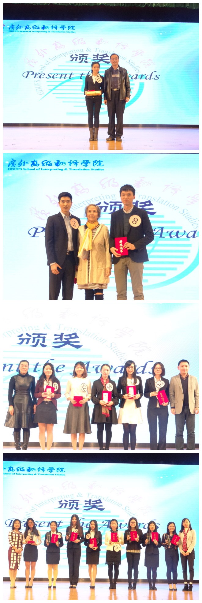 最终,11号选手孙廉咪凭借着超强实力和稳定出色的临场发挥,摘得本次口译大赛的桂冠,8号选手周天元和2号选手陈伟奇获得二等奖。我院院长赵军峰、英文学院教授冯之林、副院长詹成、党委副书记杜焕君、评委夏之梦、评委郭聪分别为获奖同学颁奖。
