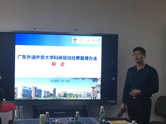 陈平首先对《广东外语外贸大学科研项目经费管理办法》(以下简称《办法》)做了详细解读,他首先提及《办法》的修订背景及依据,主要亮点为:创新科研激励机制,创新科研支撑模式,创新服务方式。《办法》的最大变化之一是把项目资金分为直接费用和间接费用,间接费用以绩效支出形式提供激励,有效激发了教职工参与科研工作的积极性和创造性。对于报销类别及注意事项,陈平也做了详细讲解。