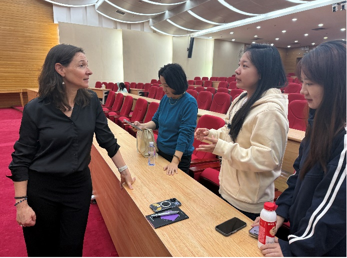 在讲座后的交流环节,同学们积极提问,内容包括学校是否应增设AI学习课程、AI时代译员是否会被迫处于被支配地位以及AI使用频率及评估标准等问题,Burian教授耐心地为每位同学提供了专业的建议。她通过分享自身经历,指出译员具有独特的价值,并非处于被支配地位,鼓励学生正确看待AI工具,增强专业自信。