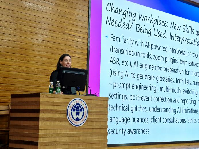 讲座伊始,Burian教授带领大家回溯了传统口笔译所需技能、工作环境和教育教学模式。随后,她指出,随着AI的涌现及迅猛发展,译员面临着工作环境的改变,这就要求译员们持续学习并掌握各种新技能、灵活运用新型智能工具,以便在AI时代中立足。译员要抓住AI带来的机遇,提升翻译效率及准确性,同时应对AI带来的相应风险和挑战。
