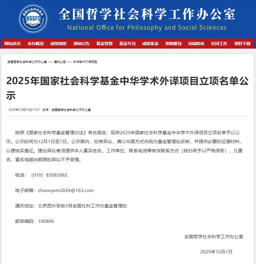 据悉,2025年国家社会科学基金中华学术外译项目公示名单中,我校拟立项6项,全国排名第2,广东省第1,近三年稳居全国前列。截至目前,学校已获国家社科基金项目46项。本次外译项目立项涉及英语、阿拉伯语、俄语、韩语、希腊语等5个语种,其中希腊语为全国唯一立项语种。十四五以来,我校已获资助国家社科中华学术外译项目25项,全国排名第3,同比增长108%,国际传播能力和服务国家发展战略水平显著提升。