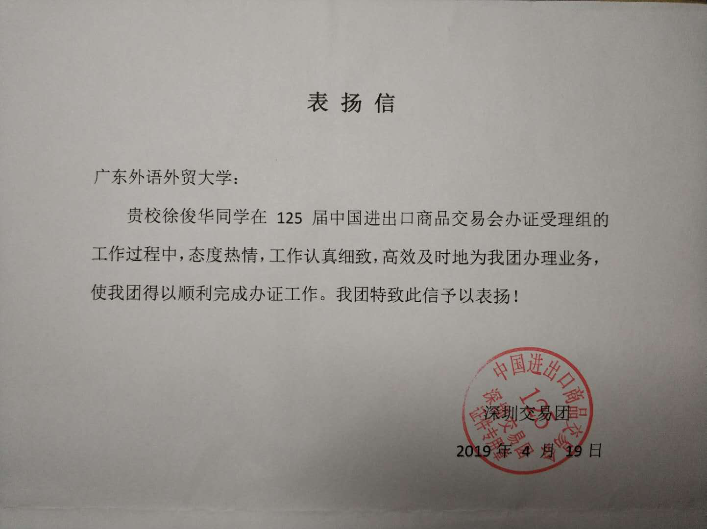 今年我院共有59名2016级本科学子参加广交会实习,主要分布在办证中心,岗位有翻译中心、采购商验证、内宾办证和综合事务组等。展会期间,我院学子专业的服务和敬业的精神得到了广交会交易团和境内外客商的广泛好评。