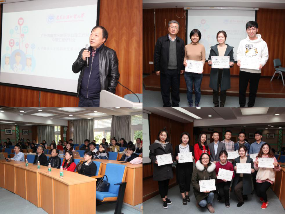 研讨会现场:李瑞林院长发言(左上),李和民书记(右上)为龚滢瀛等优秀志愿者和学员颁奖