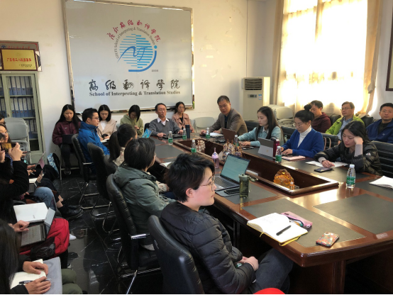 12月6日上午,高级翻译学院高层次科研项目申报专题指导会在第四教学楼402室举行,广东外语外贸大学翻译学研究中心黄忠廉教授以“聊聊项目申报重中之重”为题,为翻译学院教师申报课题把脉。讲座由高翻学院副院长邢杰主持。