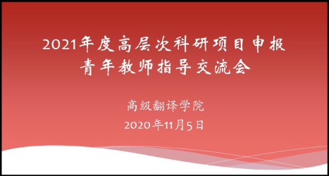 为全面提升2021年度高层次项目申报的质量,提高项目申报立项率,根据大学及科研处的部署,我院于11月5日下午开展2021年度高层次科研项目申报青年教工指导交流会。本次指导会由高级翻译学院副院长邢杰主持,邀请高级翻译学院教授蓝红军和张保红做申报指导,申报本年度高层次科研项目的青年教师积极参会。