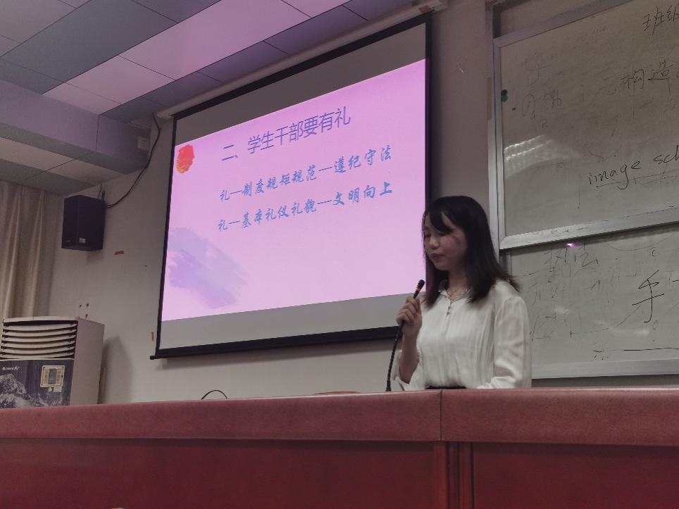 首先,由校团委龙飘飘老师为同学们讲解如何成为一名优秀的学生干部。首先,她询问在场学生:“为什么选择成为一名学生干部”,并让几位同学进行了分享。随后,她围绕“六有”——有德、有礼、有责、有心、有才、有力,为大家讲解了学生干部应有的能力与素质,并用骆乐安、王明哲等学生干部前辈的事例让学生干部们更好地理解这“六有”的意义。最后,龙飘飘老师表达了对在场全体学生干部的期望,希望同学们能在工作中有所收获,有所成长。