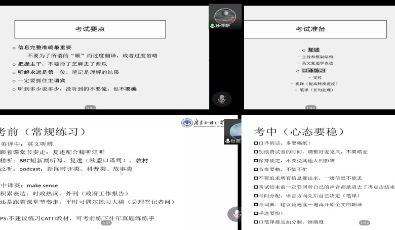 首先,张卓凡强调了练习真题的重要性,并建议同学们不要过度依赖字典,在进行中译英的过程中应避免使用大词、难词和长难句。他表示,同一篇材料可以反复、逆向练习,建议同学们平时练习注意提高打字速度,这样在机考时代的CATTI考试中可以节省时间。杜蕊结合现阶段同学们的 口译学习,建议同学们要“以考促学”,紧跟课程节奏,通过精听泛听结合复述练习打好英文听辨基础能力,同时关注时事,积累热词表达,并分享了考前考中的注意事项,如多要稿纸,利用好试音时间确保不喷麦等。